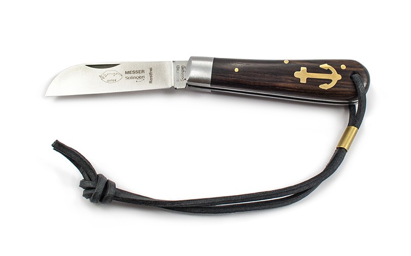 Das Ankermesser stammt aus dem maritimen Bereich und war ursprünglich ein Arbeitsmesser. Die Klinge ist gerade, so das Taue und Seile gut geschnitten werden können. Zudem eignet sie sich gut zum entschuppen von Fischen. Die abgerundete Oberseite der Klinge verhindert Verletzungen bei schwerem Seegang. Die Bohrung und Leder-Schlaufe ermöglicht ein Sichern des Messers gegen Verlust. Der Messing-Anker ist in das Holz eingelassen und fest vernietet. Die Klassiker mit Lederband & Messinghülse.